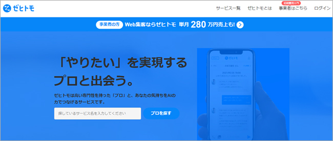 「ゼヒトモ」は、プロを探す手間やコストを抑えつつ、クオリティの高い専門家と手軽に出会えるサービスです。